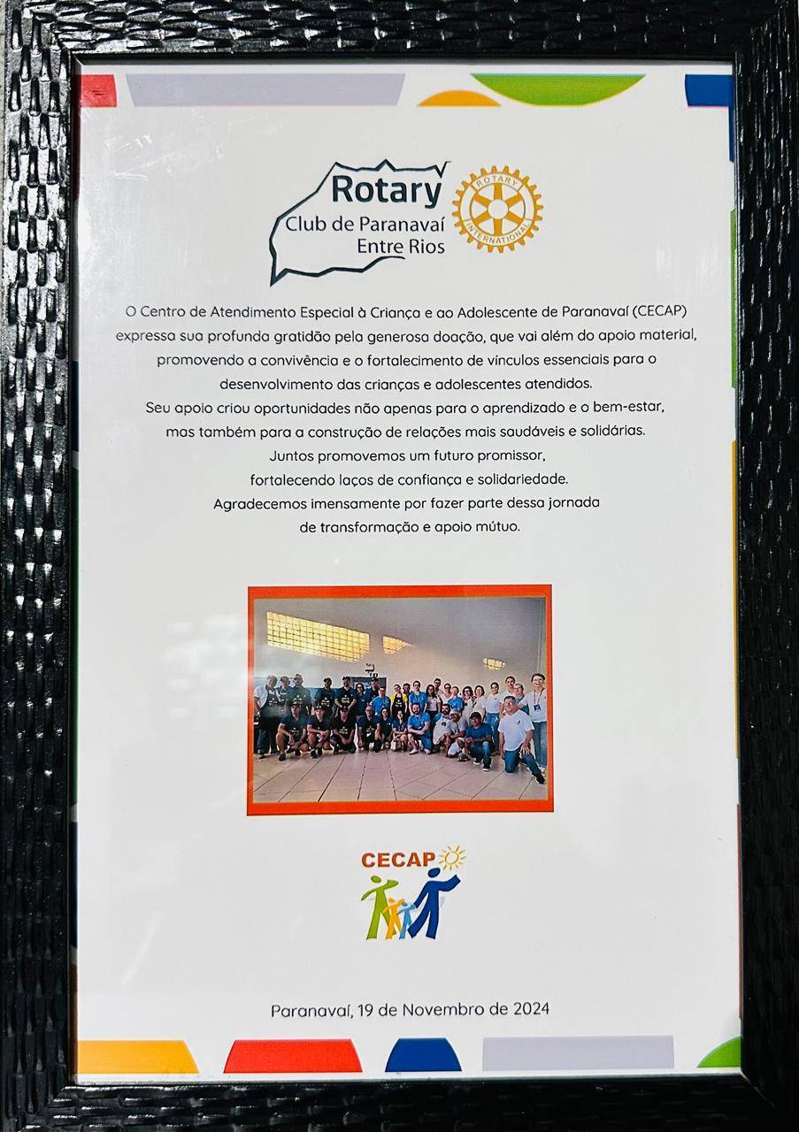 E nós do Rotary Club de Paranavaí Entre Rios, em homenagem, recebemos um quadro, com uma foto da equipe em trabalho, e um livro desenvolvido pela entidade, como forma de agradecimento, pelo evento solidário em prol da mesma, promoção de arroz carreteiro, do qual participamos de toda organização voltada ao preparo das refeições, ficando a entidade responsável pelas vendas dos cartões, despesas, receitas.